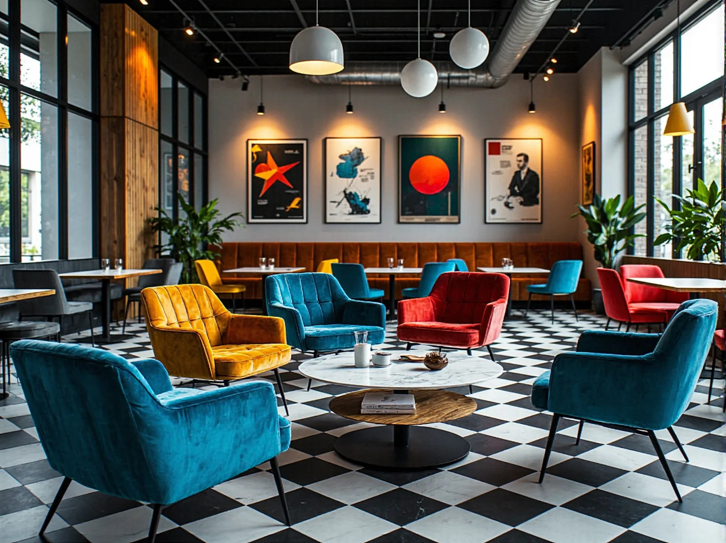 Ściany kawiarni nie mogą być puste. Zamiast przypadkowych obrazków, stwórz przemyślaną galerię. Styl retro kocha plakaty – stare reklamy kawy, grafiki z czasopism z lat 60., czy filmowe postery. Kluczem do wprowadzenia nowoczesnego akcentu jest sposób ich ekspozycji.