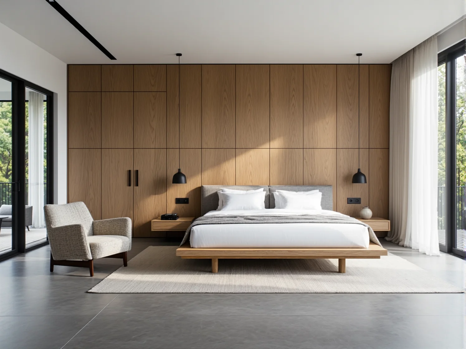 Doskonałym rozwiązaniem są meble lewitujące – podwieszane szafki nocne, biurka czy konsole RTV. Odsłonięcie podłogi sprawia, że pokój wydaje się większy. Warto również zainwestować w zabudowę stolarską na wymiar, która „wtapia się” w ściany. Szafa wnękowa z gładkimi frontami bez uchwytów (system push-to-open) staje się niewidoczna, a jednocześnie oferuje mnóstwo miejsca na bagaż gości.