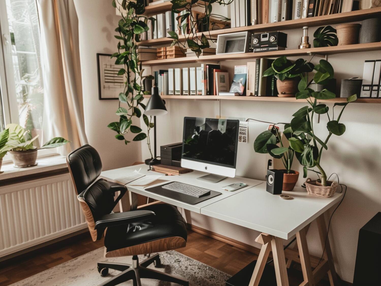 Domowe biuro w stylu skandynawskim może być zarówno minimalistyczne, jak i funkcjonalne. Drewniane biurko z cienkimi, metalowymi nogami, wygodne krzesło w nowoczesnej formie oraz lampa biurkowa o prostym, ale eleganckim designie tworzą przestrzeń sprzyjającą pracy i koncentracji. Dodanie kilku roślin doniczkowych sprawia, że wnętrze staje się bardziej przyjazne.