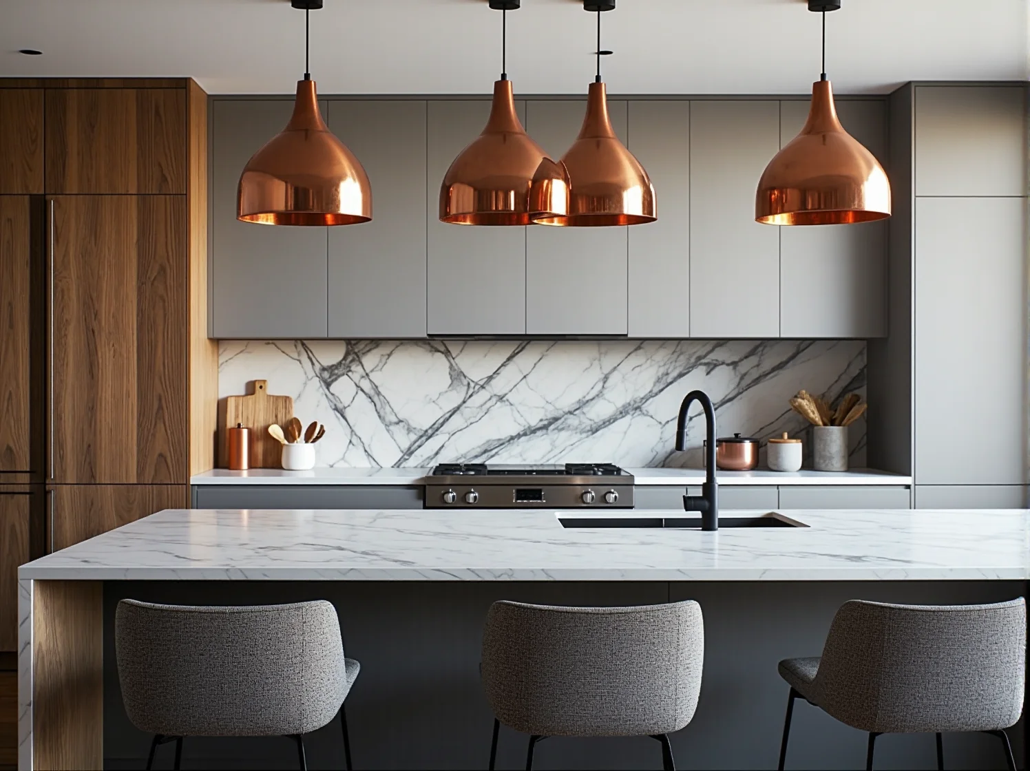 Miedź to nie tylko surowe lofty. W nowoczesnych kuchniach, a także tych urządzonych w stylu glamour, miedziane lampy wiszące mogą dodać wnętrzu luksusowego charakteru. Tutaj liczy się połysk, wyrafinowana forma i dbałość o detal.