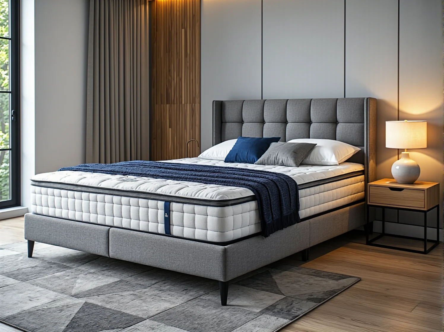 - Materace hybrydowe (Visco + Sprężyny Kieszeniowe): Nowoczesne rozwiązanie łączące zalety obu światów. Sprężyny kieszeniowe (pocket) zapewniają punktowe podparcie i lepszą wentylację wewnątrz materaca, a gruba warstwa visco na wierzchu niweluje ucisk sprężyn. To dobra opcja dla osób cięższych, które potrzebują solidniejszego podparcia progresywnego.
