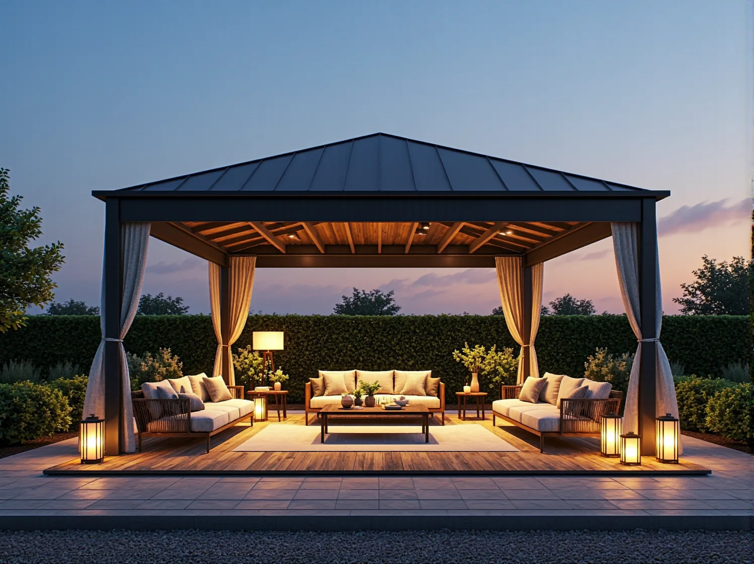 - Lampiony i latarnie: Duże, przeszklone latarnie ze stali nierdzewnej ustawione na podłodze tarasu tworzą romantyczny nastrój.