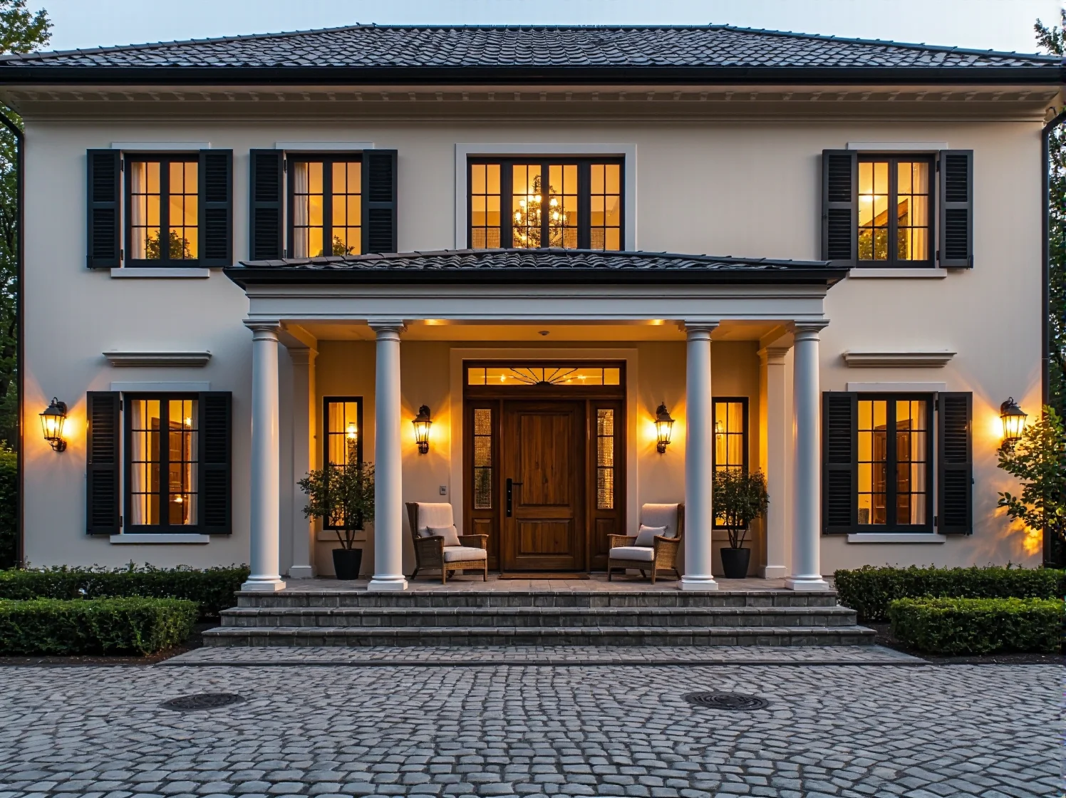 Warto podkreślić rytm okien, montując niewielkie kinkiety między nimi lub pod parapetami (o ile pozwala na to konstrukcja). Jeśli dom posiada kolumny, pilastry lub wykusze, można je wyeksponować za pomocą reflektorów gruntowych (typu „uplight”) umieszczonych w opasce wokół domu. Choć to rozwiązanie nowocześniejsze, przy odpowiednim doborze barwy światła i dyskretnej oprawie, doskonale wydobywa trójwymiarowość klasycznej bryły.