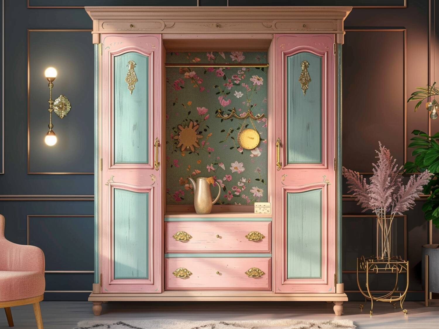Jeśli nie chcesz malować, możesz okleić drzwi lub wnętrze szafy tapetą lub folią samoprzylepną. To szybki sposób na odświeżenie wyglądu mebla i nadanie mu indywidualnego charakteru.