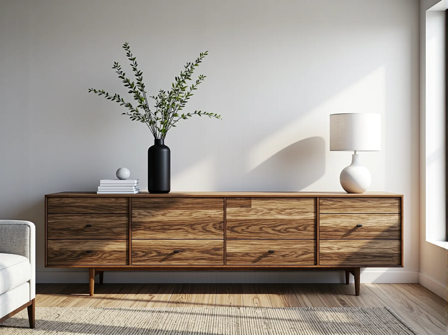 Minimalizm nie oznacza rezygnacji z natury. Wręcz przeciwnie, style takie jak Japandi (połączenie skandynawskiej funkcjonalności z japońskim minimalizmem) czy Soft Minimalism chętnie sięgają po drewno. Komody fornirowane dębem lub orzechem ocieplają surowe wnętrza. Ważne jednak, aby usłojenie drewna nie było zbyt agresywne ani sękate. W minimalizmie szukamy drewna o spokojnym, liniowym rysunku, które wprowadza teksturę, ale nie chaos.